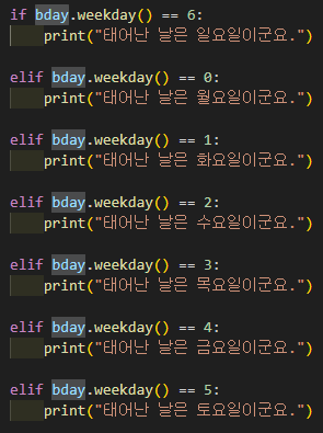 저는 위의 vs code 편집기에서 파이썬 코드를 작성하는 도중에 baby라는 단어를 bday라고 바꿔야되는 상황이었습니다.